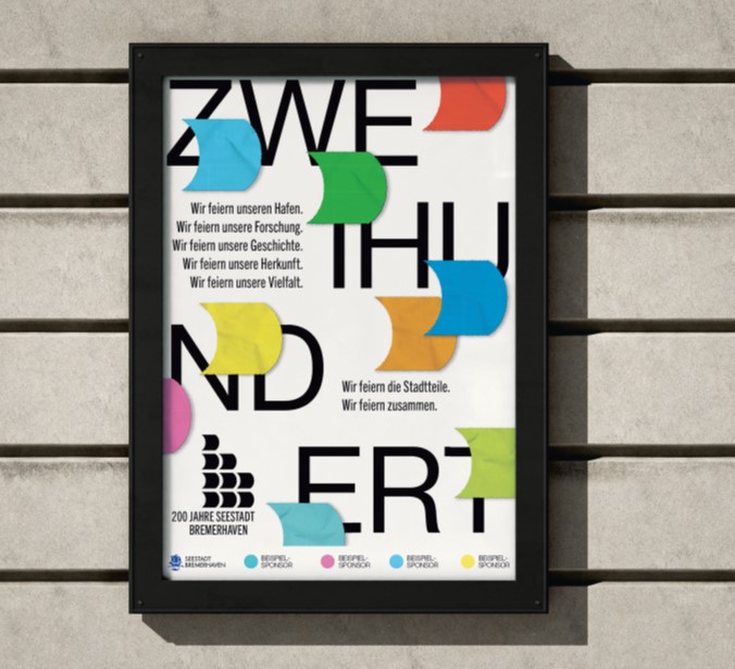Unser Claim „Wir feiern zusammen!“ bringt Jubiläum und Gemeinschaft in einem prägnanten Satz zusammen. Dabei kann das Wort „zusammen“ flexibel durch Stadtteilnamen oder besondere Eigenschaften Bremerhavens ersetzt werden und macht den Claim so vielseitig einsetzbar. Er macht deutlich, wofür das Design steht: Dieses Jubiläum gehört allen und wird nicht nebeneinander, sondern miteinander gefeiert.